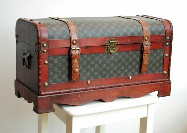 Duży kufer, ozdobna skrzynia drewniana w stylu vintage, kolonialnym. Kufer jest wykonany ze sklejki drewnianej w kolorze ...