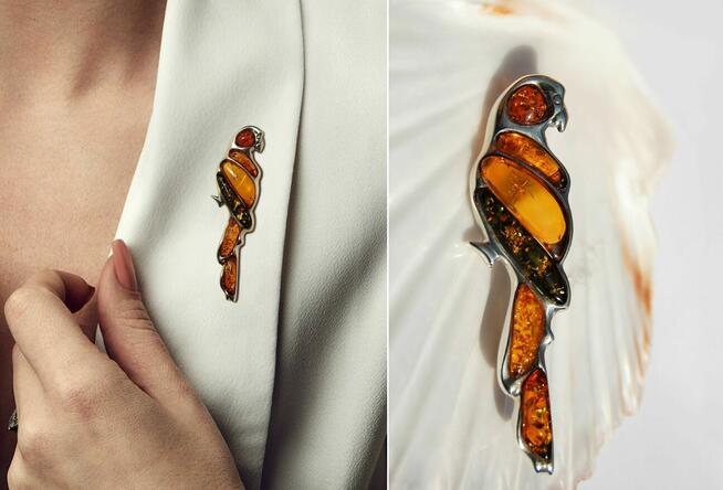 Piękna broszka - papuga z naturalnym bursztynem bałtyckim, ze srebra próby 925. Punce są wybite na ilge i broszce z tyłu ...