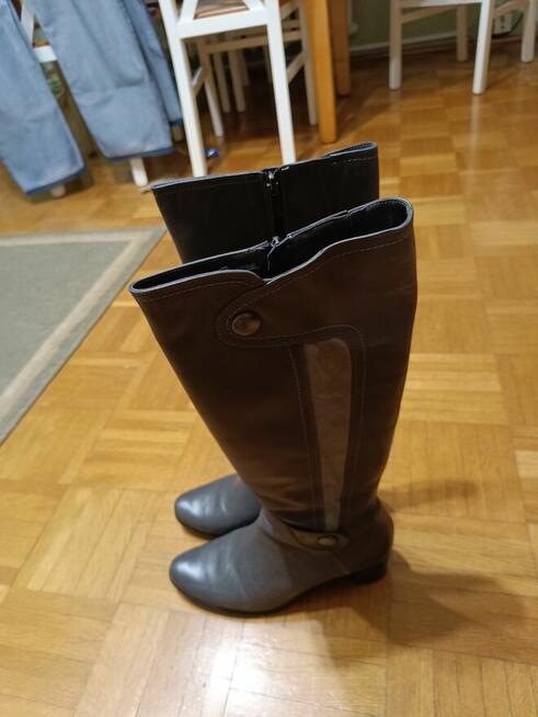 Witam mam do sprzedania mało używane buty damskie Kozaki w kolorze szarym rozmiar 38 wysokość buta 43 cm wysokość obcasa 5 cm
