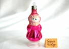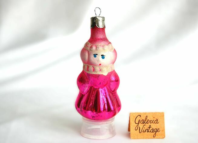 Stara bombka szklana - panienka śnieżynka z okresu PRL. Bombka jest ręcznie malowana. Kolor różowy, bieły ze szklanym ...