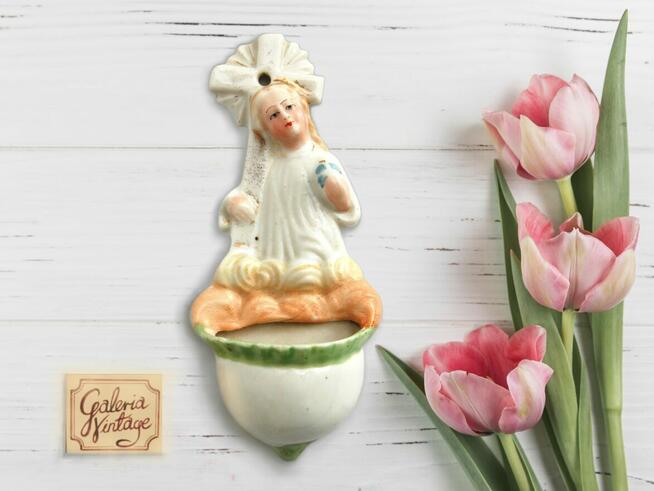 Przedwojenna, porcelanowa kropielniczka z Dzieciątkiem Jezus. Biała, szkliwiona porcelana jest ręcznie malowana ...