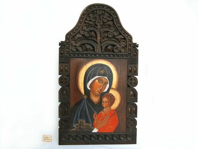 Piękna, duża ikona z Matką Bożą i Dzieciątkiem Jezus z lat 80 XX w. Ikona jest ręcznie pisana na bogato rzeźbionej, ...