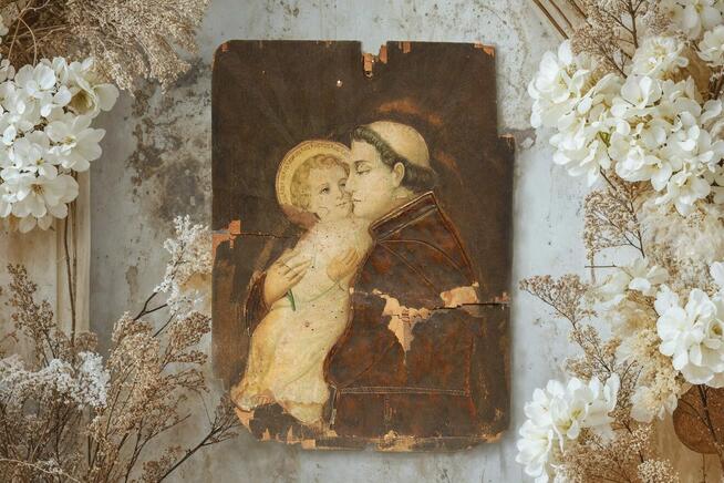 Święty Antoni trzymający na rękach Dzieciątko Jezus - przedwojenny, polski obraz religijny wykonany na drewnianej ...