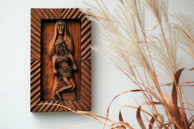 Pieta - płaskorzeźba ludowa w drewnie, polskie rękodzieło. Sygnowana: MB 1980 r. Płaskorzeźba jest wyrzeźbiona w ...