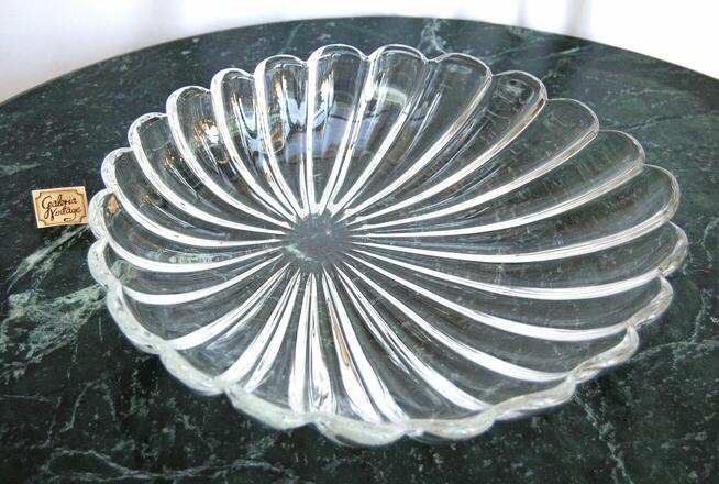 Duża, pojemna, kryształowa patera vintage w kształcie okrągłego liścia o wysokich brzegach. Marka Walther Glas, model ...