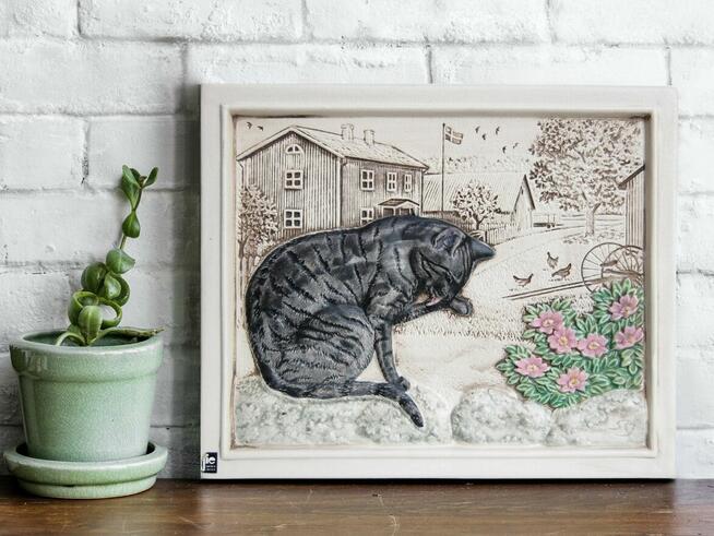 Piękny, stary, ceramiczny obrazek - płaskorzeźba z kotem na tle wiejskiego pejzażu. Jie Gantofta, Sweden, autor: Staffan ...