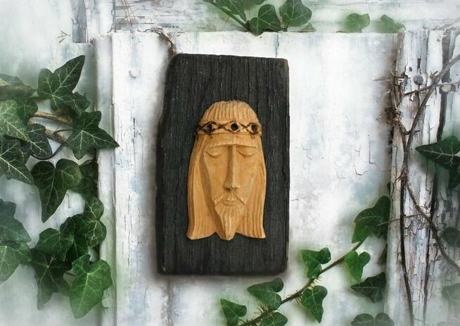 Stara, ręcznie wykonana płaskorzeźba z głową Pana Jezusa w koroniecierniowej. Datowanie: lata 70 XX w. Prawdopodobnie ...