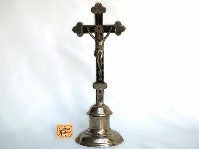 Przedwojenny, tradycyjny, polski, metalowy krucyfiks z drewnianymi elementami belek krzyża. Sygnowany od spodu podstawy: ...