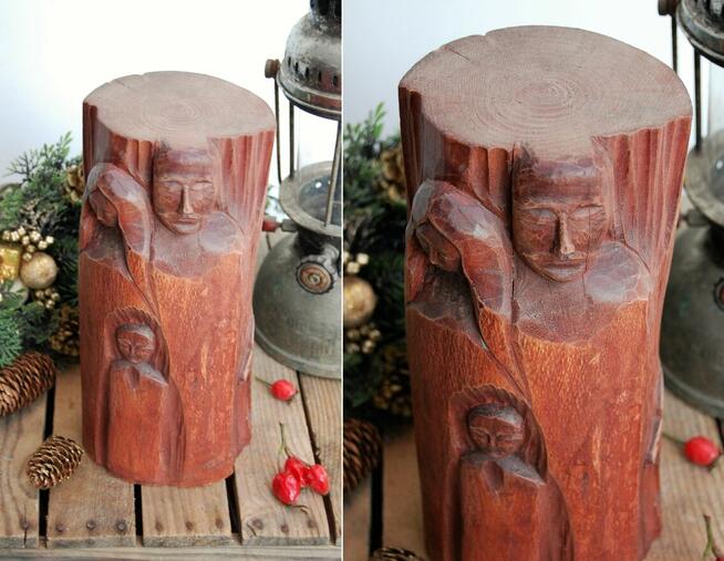 Święta Rodzina - rzeźba, rękodzieło z lat 90 XX wieku. Rzeźba jest wykonana ręcznie, dłutem w drewnianym pniaku. ...