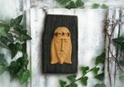 Stary, drewniany dziadek do orzechów z okresu PRL. Rękodzielniczy, unikatowy wyrób polski z częściowo czytelną, ...